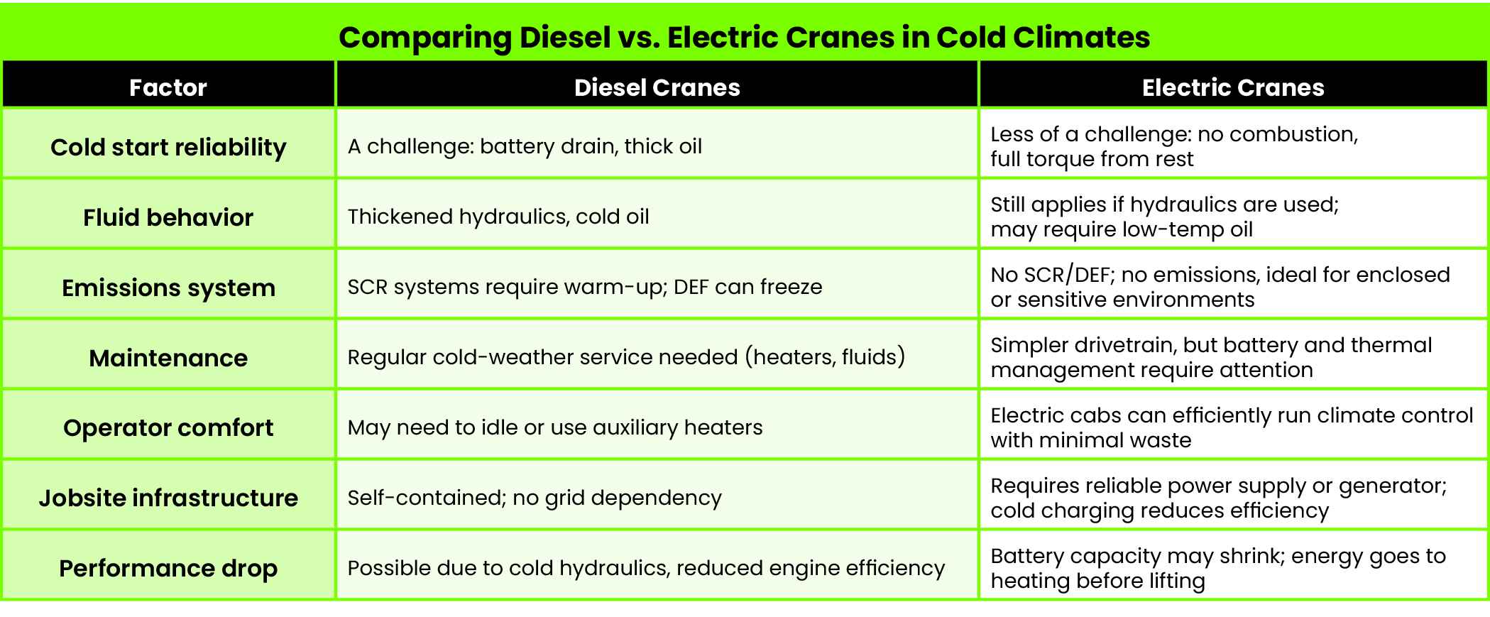 For operations in cold climates, the decision to deploy diesel or electric cranes depends on multiple factors. With smart planning and winterization practices, operators can safely navigate the trade-offs between traditional diesel power and emerging electric solutions without compromising lift capacity or uptime.