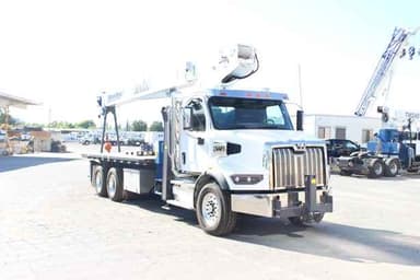 100’ Four-Section Telescopic Boom A-Frame, 7-ton hook and ball, 3- load sheave quick reeve boom head, Externally Wired anti-two block w/lockout, Boom hoist cylinder, System pressure gauge, 372° Non Continuous rotation, Removable boom rest, Engine start/stop, Operators service/parts manuals, Boom length and angle indicators, Electronic Foot throttle, Signal Horn, Bubble Level, Beverage cup holders, Braden Winch, 2-speed Hoist w/grooved drum, 335’of 9/16” Rotation Resistant Wire Rope, Subframe for 21’ Bed, 70 gallon HD reservoir w/suction strainer and ball valve, Pedestal, Swept Back Turret, Rotation bearing and Swing system, Dual Operator Control Stations, Can Bus Load moment indicator w/Internal length Cable-audio/visual capacity alert w/shutoff, Hermetically sealed Printed Circuit board electrical system w/LED Circuit Status Indicators, Audible Outrigger/Stabilizer Motion Alarm, A-frame Link Type Front Outriggers (22’4” Spread Width), Out and Down Rear Stabilizers (13’7” Spread), 3-Section Hydraulic Pump-Counterclockwise Rotation is standard, Outrigger Monitoring System. Additional Options Included: • Radio ATB – 100’ Boom • 1 Piece 26’ Jib 100’ Boom Hirsch (G) • 21’ HH Steel Bed x 102” • 3 section Vane Pump-Clockwise rotation • Hot Shift PTO • Heavy Duty Hydraulic Reservoir • 15 Ton 1-Sheave Quick Reeve Block • Front Center Stabilizer • Control valve for operation of single stabilizer, Required w/FBS • Aluminum Toolbox (48” x 24” x 24”) Chassis Mount MOUNTED ON 2023 WESTERN STAR 47X Mounted on a 2023 Western Star 47X tractor chassis with a Cummins L9 370 HP diesel engine with a Allison 3000 RDS automatic Transmission, MFS-20-133A 20,000 lb. front axle, MT40-14X 40,000 lb. tandem rear axle, TufTrac Gen2 40,000lbs. rear suspension, Single polished Aluminum 60 gallon fuel tank, Heater and air conditioner with defrosters, full instrumentation, dual heated mirrors, interior color Charcoal Black, AM/FM/WB World tuner radio with Bluetooth, USB and auxiliary inputs, dual air horns, exterior stainless steel sunvisor, Halogen headlights, and unit is painted White Elite.